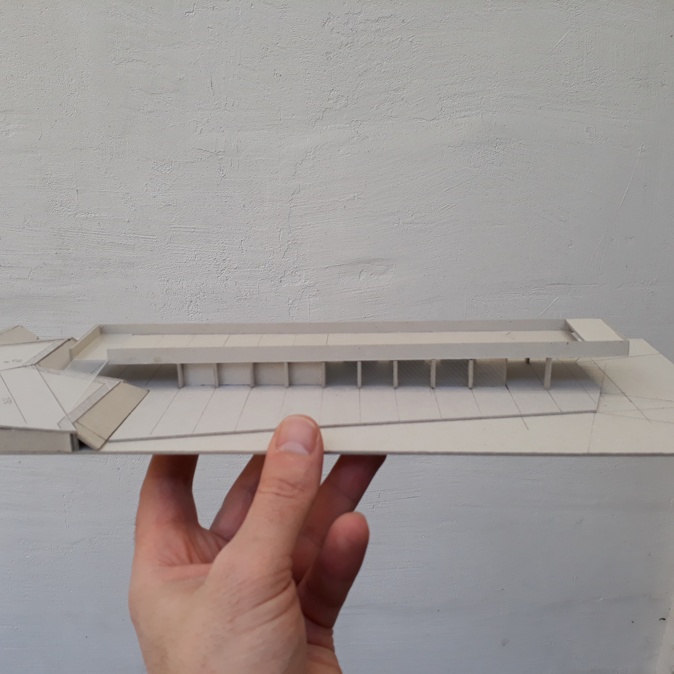 Structure en béton brut apparent coloré ocre, porte à faux de 7,2m en façade avant, éclairage incorporé à la dalle haute en partie inférieure.